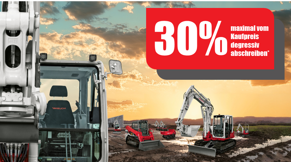 Ob es um einen neuen Bagger, eine Laderaupe oder einen Dumper geht – die Entscheidung für eine Investition war selten so attraktiv. Denn dank der neuen Regelung lassen sich Ausgaben für Maschinen in den ersten Jahren deutlich schneller steuerlich geltend machen. Im Anschaffungsjahr wird die Abschreibung mit dem 3,0-fachen (maximal 30 %) des linearen Abschreibungssatzes berechnet, in den folgenden Jahren wird dieser Prozentsatz anschließend vom jeweiligen Buchwert berechnet.